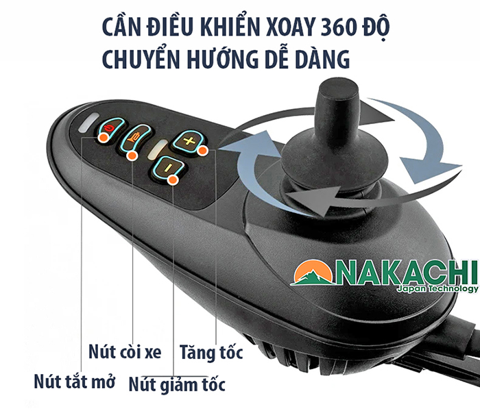 1. Cần điều khiển xe linh hoạt: Xe lăn điện gấp gọn NC-001 sử dụng cần điều khiển quay 360 độ cho phép người dùng dễ dàng di chuyển tiến lùi, rẽ trái, rẽ phải và đặc biệt là quay đầu 360 độ. Khả năng quay đâu trong khoảng bán kính nhỏ giúp xe có thể thích nghi ở những không gian nhỏ như trong nhà, ngoài sân..vvv. Cần điều khiển có khả năng chống nước nên có độ bền cao.