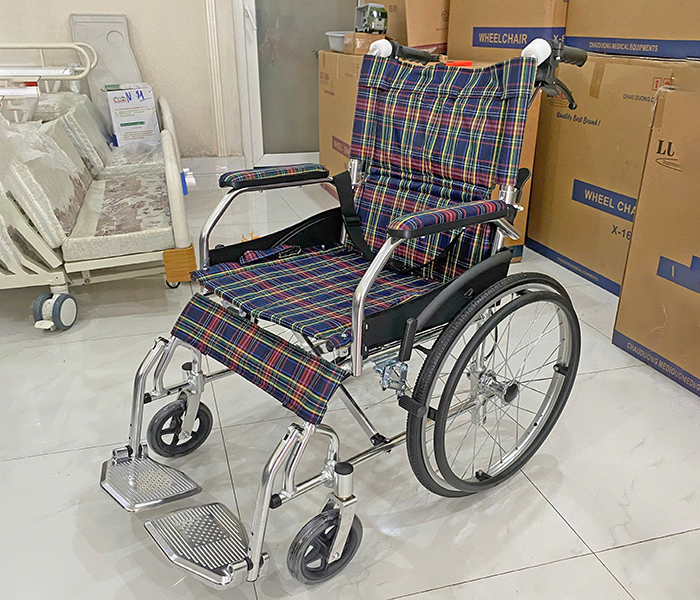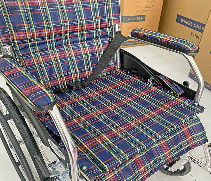 - Phần ghế ngồi và tự lưng xe lăn X63L được làm từ vải caro sang trọng, mát mẻ dễ dàng vệ sinh khi dở bẩn, giúp người ngồi lâu không bị nóng khó chịu.